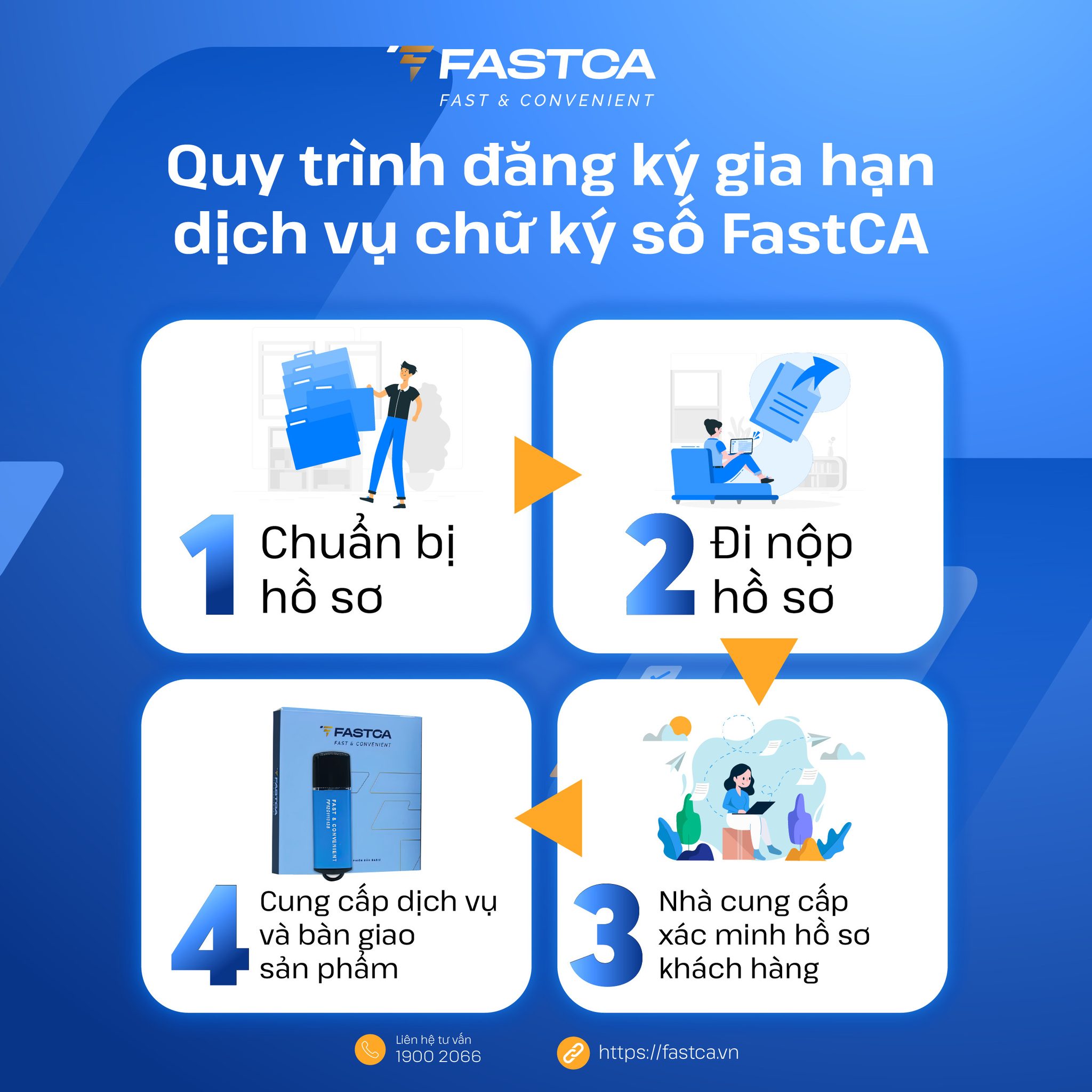 Dưới đây là quy Quy trình đăng ký gia hạn dịch vụ chứng thực chữ ký số công cộng FastCA dành cho khách hàng là tổ chức, doanh nghiệp và cá nhân: