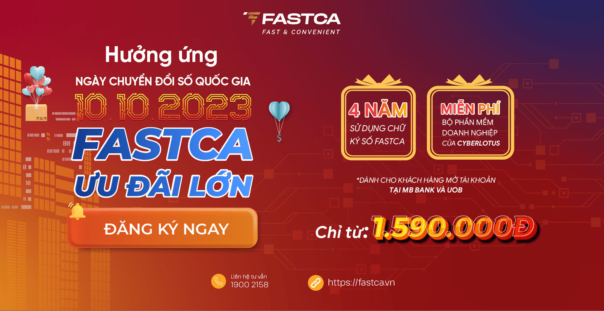 Hiện nay trong Quý 4/2023, FastCA hưởng ứng ngày chuyển đổi số quốc gia 10/10 nên có rất nhiều chương trình ưu khi khách hàng đăng ký mua sản phẩm chữ ký số. Đăng ký ngay tại đây để được đội ngũ chuyên viên của FastCA tư vấn trực tiếp bảng giá chữ ký số FastCA.