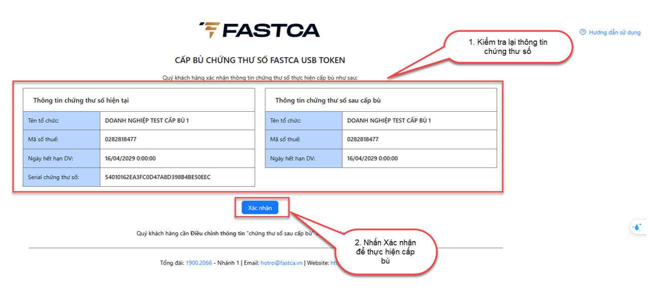 Để hoàn tất, Quý khách kiểm tra thông tin chứng thư số sau khi cấp bù thành công trên màn hình với thông tin trong USB Token và nhấn “Xác nhận”.