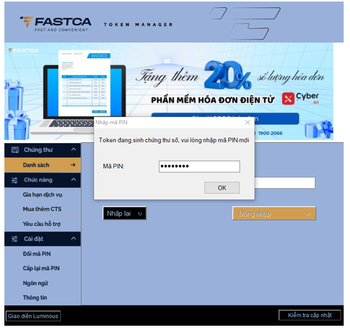 Bước 5: Nhập mã PIN Token và nhấn “OK”.
