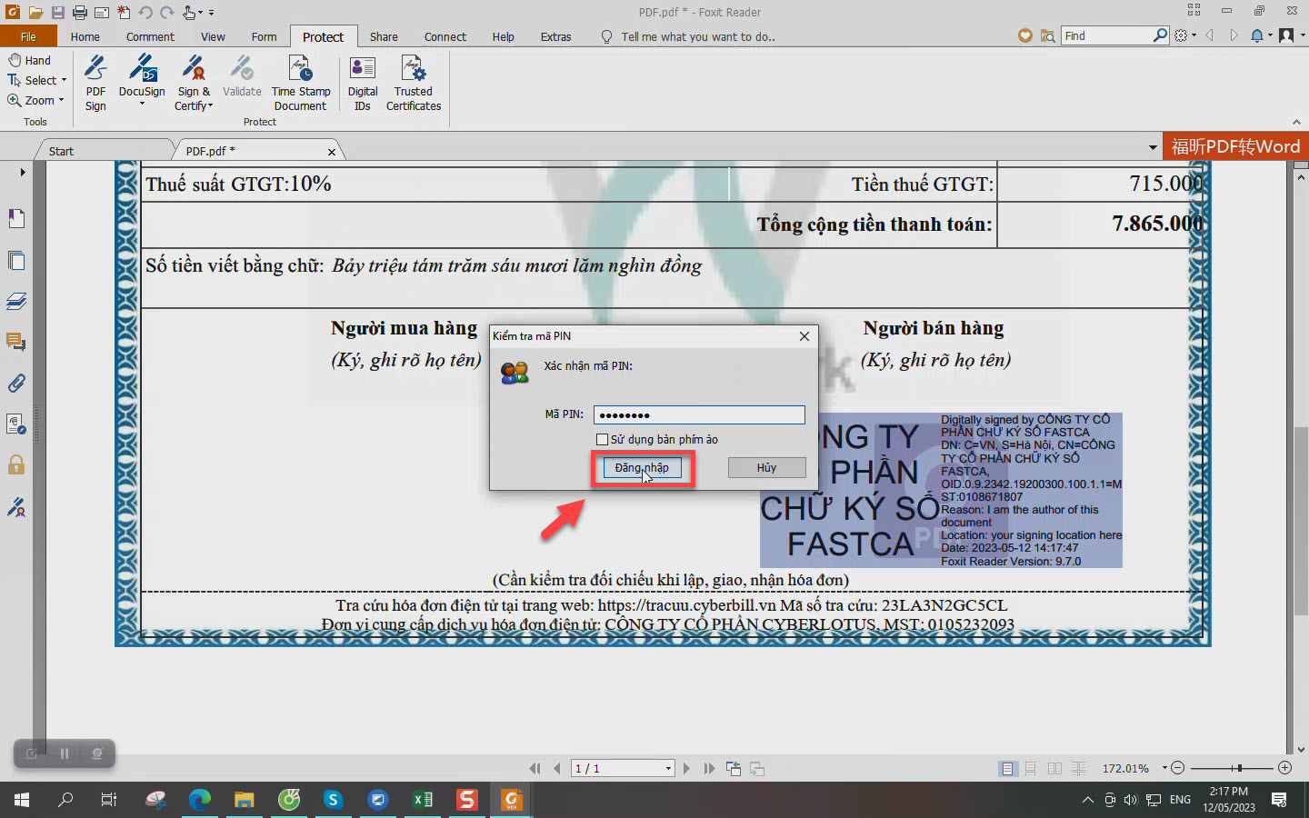Bước 6: Màn hình hiển thị bảng xác nhận ký số, bạn nhập mã pin rồi ấn Đăng nhập.
