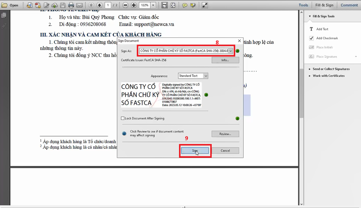 Trên đây là bài viết của FastCA hướng dẫn chi tiết cách ký chữ ký số trên file PDF trên hai phần mềm được sử dụng rộng rãi là Foxit Reader và Adobe Reader. Hiện FastCA đang là nhà cung cấp dịch vụ chứng thực chữ ký số công cộng thứ 16 trên thị trường, cam kết uy tín, chất lượng với nhiều tính năng tiện lợi. Nếu bạn quan tâm đến dịch vụ ký số hãy liên hệ ngay với FastCA để được tư vấn chi tiết hơn nhé!