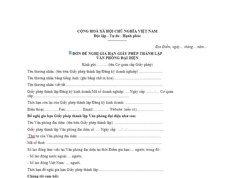 Tải mẫu đơn đề nghị gia hạn giấy phép thành lập văn phòng đại diện TẠI ĐÂY