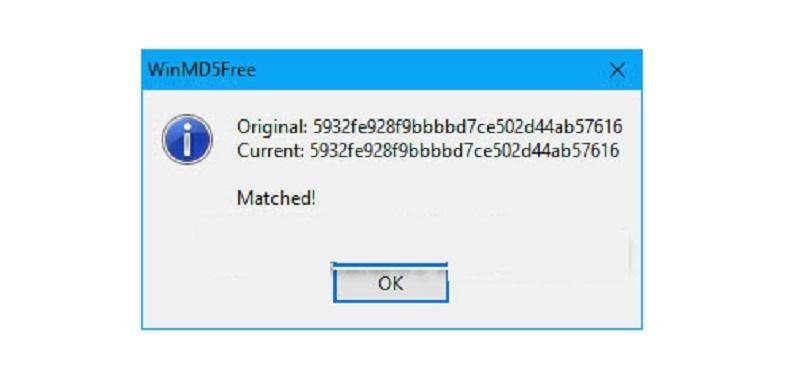 Nếu như mã MD5 của file đã trùng khớp với nhau thì hộp thoại như hình bên dưới sẽ hiển thị.